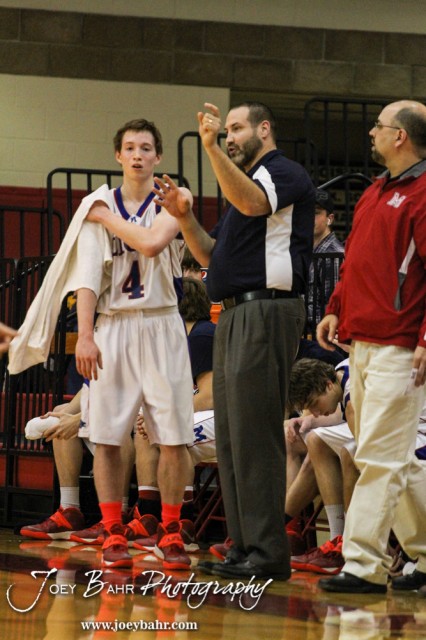 Minneapolis Lion Head Coach Erik Shupe talks to Gavin Rothenberger (#4) on the sideline during the 2014 Hoisington Cardinal Winter Jam Semi-Final basketball game with the Minneapolis Lions versus the Otis-Bison Cougars with Minneapolis winning 57 to 32 at the Hoisington Activity Center in Hoisington, Kansas on January 24, 2014. (Photo: Joey Bahr, www.joeybahr.com)