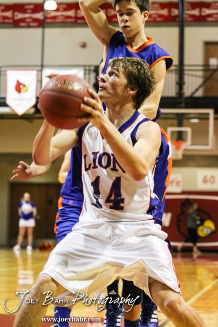 Minneapolis Lion Gage Mortimer (#14) goes up for a layup during the 2014 Hoisington Cardinal Winter Jam Semi-Final basketball game with the Minneapolis Lions versus the Otis-Bison Cougars with Minneapolis winning 57 to 32 at the Hoisington Activity Center in Hoisington, Kansas on January 24, 2014. (Photo: Joey Bahr, www.joeybahr.com)