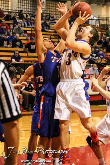 Minneapolis Lion Eric Yoxall (#3) crashes into Otis-Bison Cougar Hayden Maier (#12) during the 2014 Hoisington Cardinal Winter Jam Semi-Final basketball game with the Minneapolis Lions versus the Otis-Bison Cougars with Minneapolis winning 57 to 32 at the Hoisington Activity Center in Hoisington, Kansas on January 24, 2014. (Photo: Joey Bahr, www.joeybahr.com)