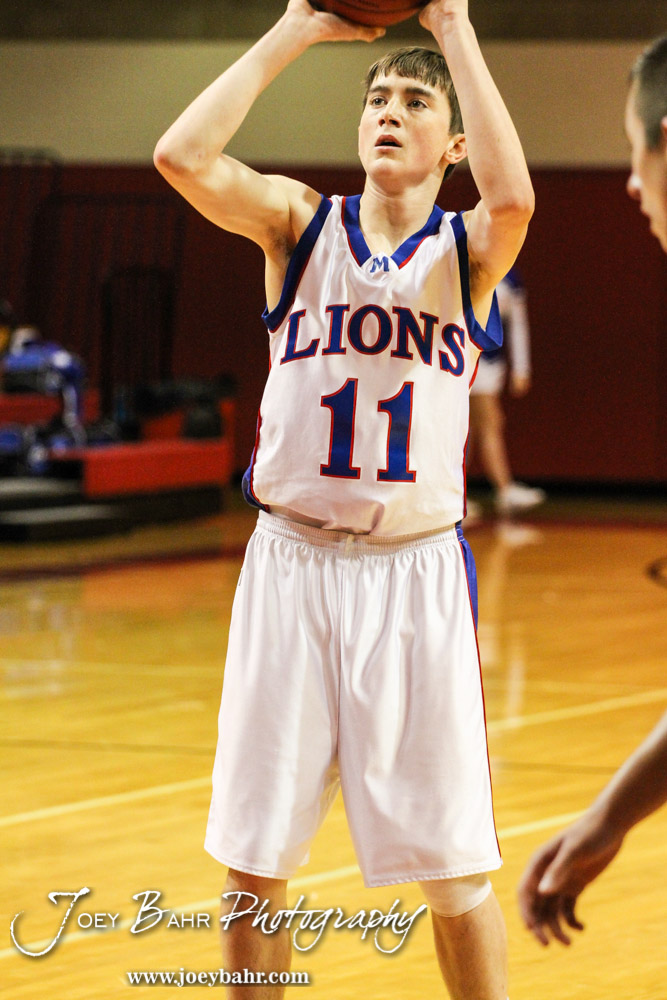 Minneapolis Lion David Johns (#11) shoots a free throw during the 2014 Hoisington Cardinal Winter Jam Semi-Final basketball game with the Minneapolis Lions versus the Otis-Bison Cougars with Minneapolis winning 57 to 32 at the Hoisington Activity Center in Hoisington, Kansas on January 24, 2014. (Photo: Joey Bahr, www.joeybahr.com)