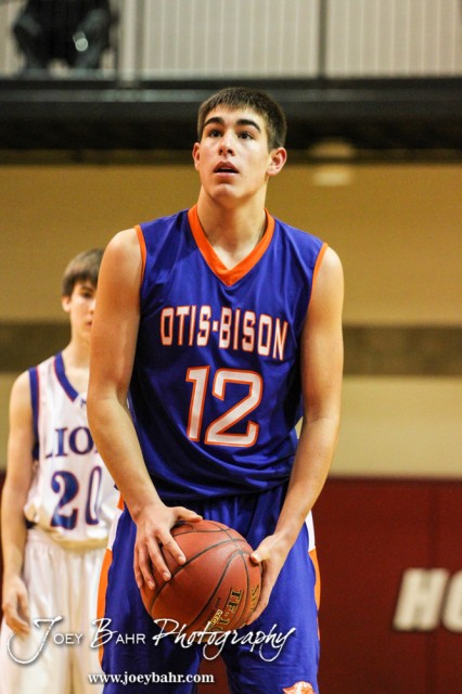 Otis-Bison Cougar Hayden Maier (#12) shoots a free throw during the 2014 Hoisington Cardinal Winter Jam Semi-Final basketball game with the Minneapolis Lions versus the Otis-Bison Cougars with Minneapolis winning 57 to 32 at the Hoisington Activity Center in Hoisington, Kansas on January 24, 2014. (Photo: Joey Bahr, www.joeybahr.com)