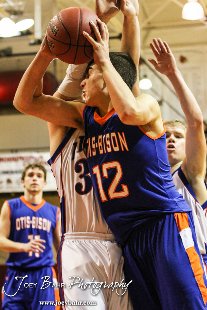 Otis-Bison Cougar Hayden Maier (#12) goes into the lane during the 2014 Hoisington Cardinal Winter Jam Semi-Final basketball game with the Minneapolis Lions versus the Otis-Bison Cougars with Minneapolis winning 57 to 32 at the Hoisington Activity Center in Hoisington, Kansas on January 24, 2014. (Photo: Joey Bahr, www.joeybahr.com)