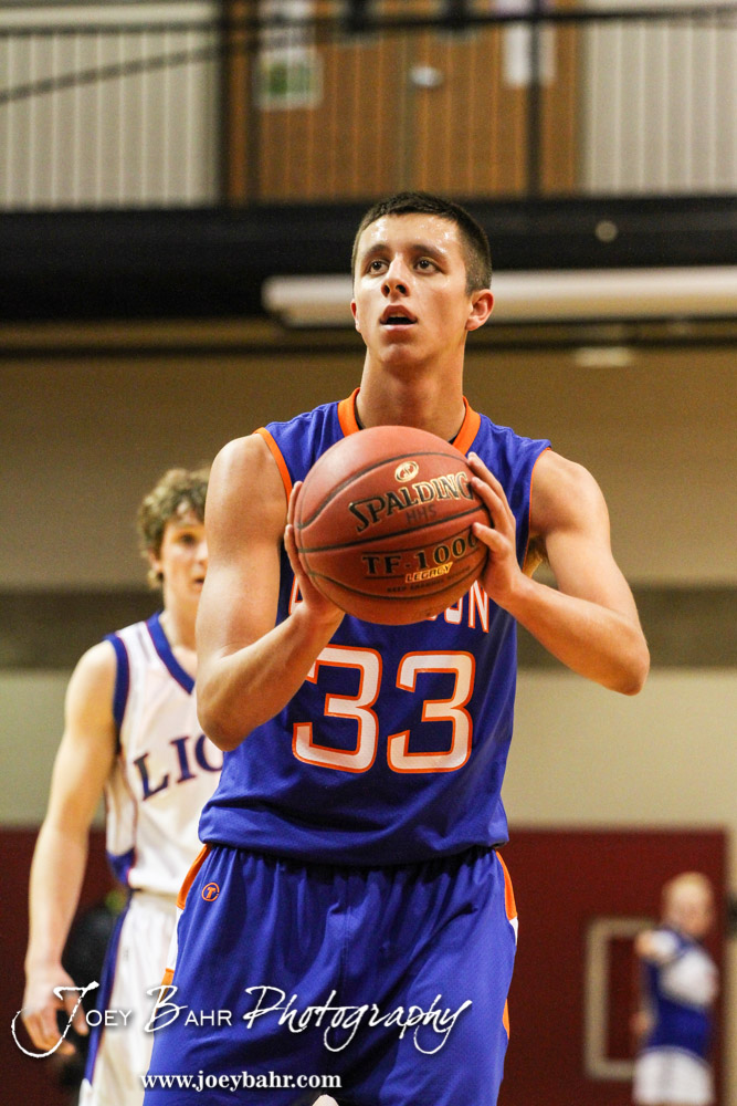 Otis-Bison Cougar Kyle Patrick (#33) shoots a free throw during the 2014 Hoisington Cardinal Winter Jam Semi-Final basketball game with the Minneapolis Lions versus the Otis-Bison Cougars with Minneapolis winning 57 to 32 at the Hoisington Activity Center in Hoisington, Kansas on January 24, 2014. (Photo: Joey Bahr, www.joeybahr.com)