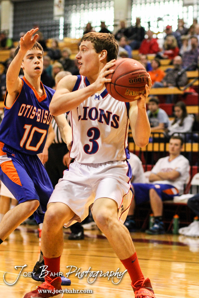 Minneapolis Lion Eric Yoxall (#3) looks for a teammate to pass the ball to during the 2014 Hoisington Cardinal Winter Jam Semi-Final basketball game with the Minneapolis Lions versus the Otis-Bison Cougars with Minneapolis winning 57 to 32 at the Hoisington Activity Center in Hoisington, Kansas on January 24, 2014. (Photo: Joey Bahr, www.joeybahr.com)