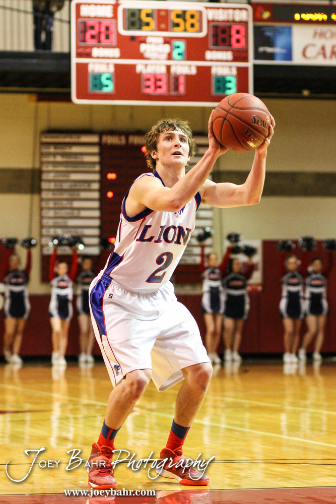 Minneapolis Lion Josh Macy (#2) shoots a free throw during the 2014 Hoisington Cardinal Winter Jam Semi-Final basketball game with the Minneapolis Lions versus the Otis-Bison Cougars with Minneapolis winning 57 to 32 at the Hoisington Activity Center in Hoisington, Kansas on January 24, 2014. (Photo: Joey Bahr, www.joeybahr.com)