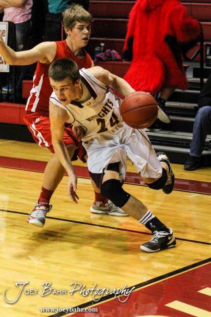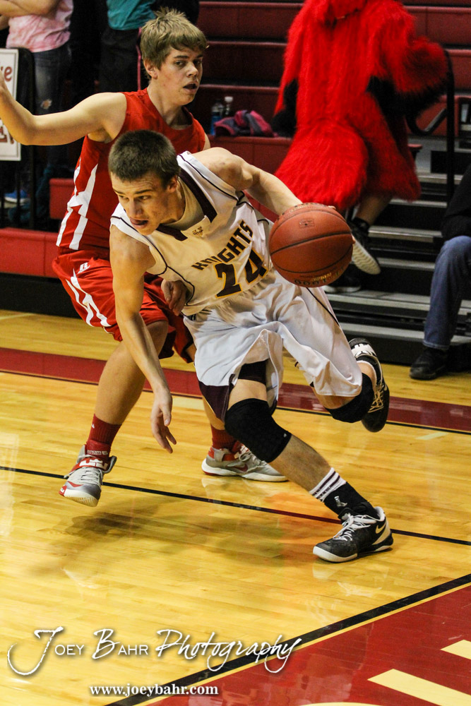 Victoria Knight Clayton Roth (#24) drives around Hoisington Cardinal Grant Dolechek (#22) during the 2014 Hoisington Cardinal Winter Jam First Round basketball game with the Victoria Knights versus the Hoisington Cardinals with Hoisington winning 68 to 54 in Hoisington Activity Center in Hoisington, Kansas on January 20, 2014. (Photo: Joey Bahr, www.joeybahr.com)
