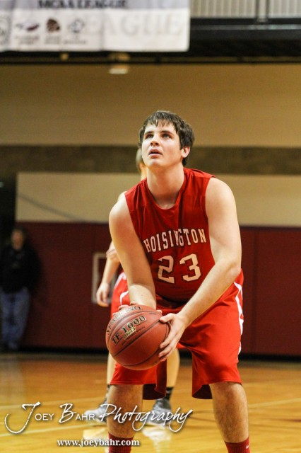 Hoisington Cardinal Christopher Wright (#23) shoots a free throw attempt during the 2014 Hoisington Cardinal Winter Jam First Round basketball game with the Victoria Knights versus the Hoisington Cardinals with Hoisington winning 68 to 54 in Hoisington Activity Center in Hoisington, Kansas on January 20, 2014. (Photo: Joey Bahr, www.joeybahr.com)