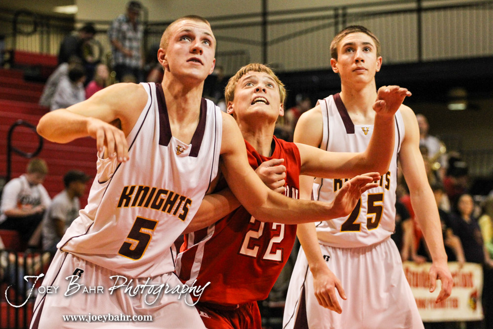 Victoria Knight Connor Gagnon (#5) tries to box out Hoisington Cardinal Grant Dolechek (#22) during the 2014 Hoisington Cardinal Winter Jam First Round basketball game with the Victoria Knights versus the Hoisington Cardinals with Hoisington winning 68 to 54 in Hoisington Activity Center in Hoisington, Kansas on January 20, 2014. (Photo: Joey Bahr, www.joeybahr.com)