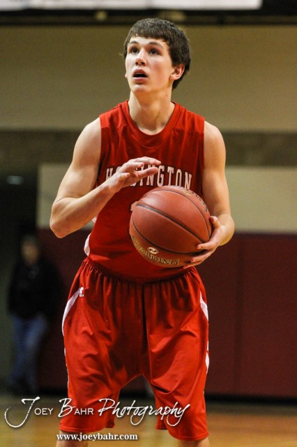 Hoisington Cardinal Brad Reif (#1) lines up his free throw attempt shot during the 2014 Hoisington Cardinal Winter Jam First Round basketball game with the Victoria Knights versus the Hoisington Cardinals with Hoisington winning 68 to 54 in Hoisington Activity Center in Hoisington, Kansas on January 20, 2014. (Photo: Joey Bahr, www.joeybahr.com)