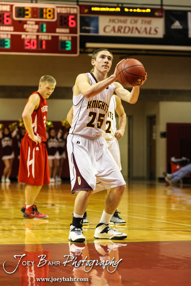 Victoria Knight Noah Dreiling (#25) shoots a free throw attempt during the 2014 Hoisington Cardinal Winter Jam First Round basketball game with the Victoria Knights versus the Hoisington Cardinals with Hoisington winning 68 to 54 in Hoisington Activity Center in Hoisington, Kansas on January 20, 2014. (Photo: Joey Bahr, www.joeybahr.com)