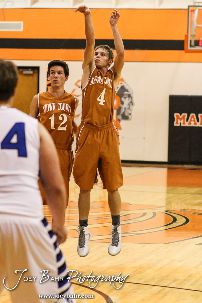 Kiowa County Maverick Landon Davis (#4) shoots a field goal during the Seventh Annual Keady Basketball Classic First Round game between the St. John Tigers and the Kiowa County Mavericks with St. John winning 74 to 30 at Larned Middle School in Larned, Kansas on December 9, 2014. (Photo: Joey Bahr, www.joeybahr.com)