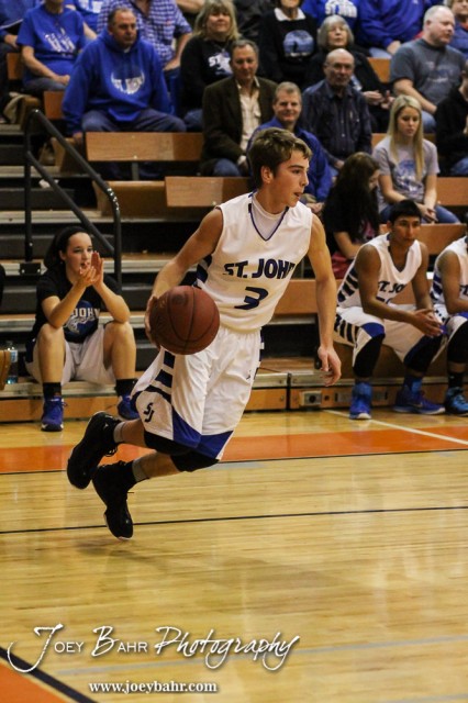 St. John Tiger Quincy Smith (#3) dribbles the ball during the Seventh Annual Keady Basketball Classic First Round game between the St. John Tigers and the Kiowa County Mavericks with St. John winning 74 to 30 at Larned Middle School in Larned, Kansas on December 9, 2014. (Photo: Joey Bahr, www.joeybahr.com)