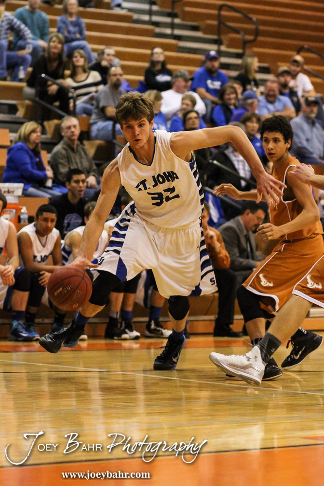 St. John Tiger Dean Wade (#32) drives with the ball during the Seventh Annual Keady Basketball Classic First Round game between the St. John Tigers and the Kiowa County Mavericks with St. John winning 74 to 30 at Larned Middle School in Larned, Kansas on December 9, 2014. (Photo: Joey Bahr, www.joeybahr.com)