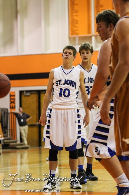 St. John Tiger Cole Kinnamon (#10) reacts to missing a free throw during the Seventh Annual Keady Basketball Classic First Round game between the St. John Tigers and the Kiowa County Mavericks with St. John winning 74 to 30 at Larned Middle School in Larned, Kansas on December 9, 2014. (Photo: Joey Bahr, www.joeybahr.com)