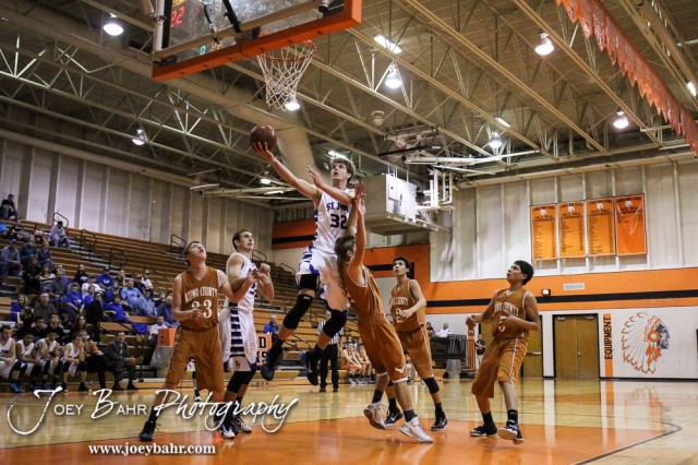 St. John Tiger Dean Wade (#32) goes for a layup during the Seventh Annual Keady Basketball Classic First Round game between the St. John Tigers and the Kiowa County Mavericks with St. John winning 74 to 30 at Larned Middle School in Larned, Kansas on December 9, 2014. (Photo: Joey Bahr, www.joeybahr.com)