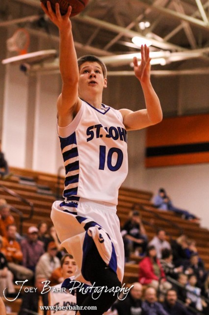 St. John Tiger Cole Kinnamon (#10) goes up for a layup during the Seventh Annual Keady Basketball Classic First Round game between the St. John Tigers and the Kiowa County Mavericks with St. John winning 74 to 30 at Larned Middle School in Larned, Kansas on December 9, 2014. (Photo: Joey Bahr, www.joeybahr.com)