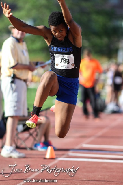 Leavenworth’s Devin Wheeler competes in the 5A Girls Triple Jump during the First Day of the 2014 KSHSAA State Track Meet at Cessna Stadium on the campus of Wichita State University in Wichita, Kansas on May 30, 2014. (Photo: Joey Bahr, www.joeybahr.com)