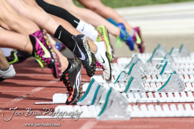 Competitors launch out of the starting blocks during the First Day of the 2014 KSHSAA State Track Meet at Cessna Stadium on the campus of Wichita State University in Wichita, Kansas on May 30, 2014. (Photo: Joey Bahr, www.joeybahr.com)