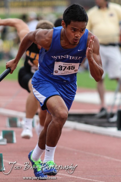 Winfield’s Noah Hunt launches out of the blocks in the Preliminaries of the 4A Boys 4×100 Meter Relay during the First Day of the 2014 KSHSAA State Track Meet at Cessna Stadium on the campus of Wichita State University in Wichita, Kansas on May 30, 2014. (Photo: Joey Bahr, www.joeybahr.com)