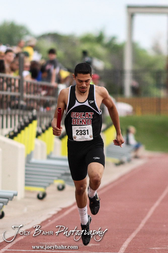 Antonio Carrasco of Great Bend crosses the finish line in the 5A Boys 4×100 Meter Relay Preliminaries during the First Day of the 2014 KSHSAA State Track Meet at Cessna Stadium on the campus of Wichita State University in Wichita, Kansas on May 30, 2014. (Photo: Joey Bahr, www.joeybahr.com)