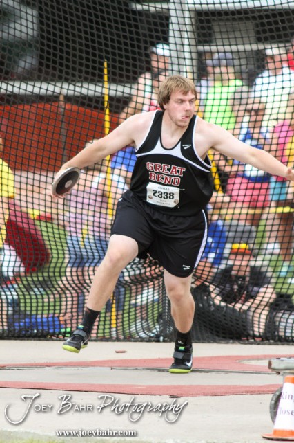 Nick Warren of Great Bend throws in the 5A Boys Discus during the First Day of the 2014 KSHSAA State Track Meet at Cessna Stadium on the campus of Wichita State University in Wichita, Kansas on May 30, 2014. (Photo: Joey Bahr, www.joeybahr.com)