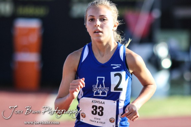 Andover’s Carly Flake runs in the 5A Girls 3200 Meter Run during the First Day of the 2014 KSHSAA State Track Meet at Cessna Stadium on the campus of Wichita State University in Wichita, Kansas on May 30, 2014. (Photo: Joey Bahr, www.joeybahr.com)