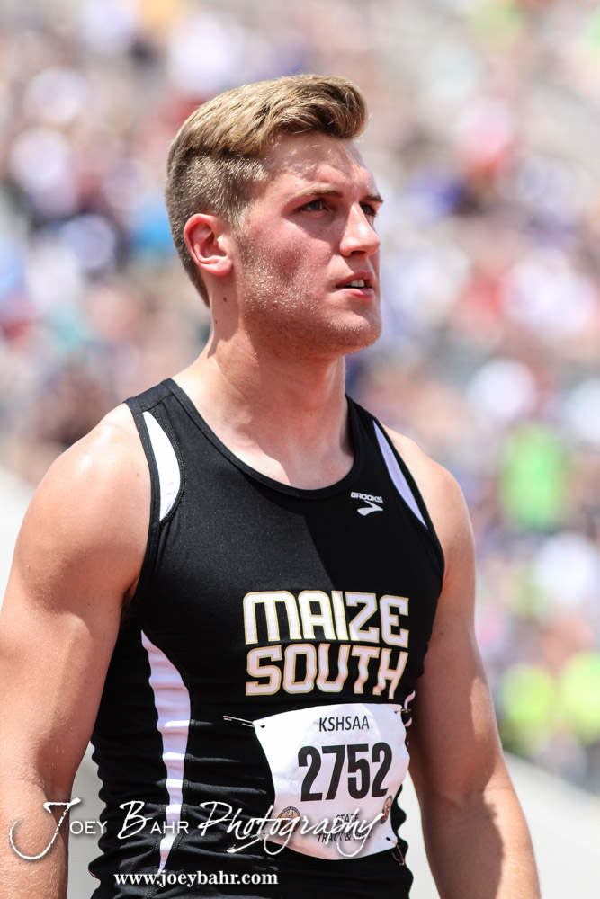 Maize South’s Jeremiah Fettke waits for the 5A Boys 4×400 Meter Relay Preliminary to start during the First Day of the 2014 KSHSAA State Track Meet at Cessna Stadium on the campus of Wichita State University in Wichita, Kansas on May 30, 2014. (Photo: Joey Bahr, www.joeybahr.com)
