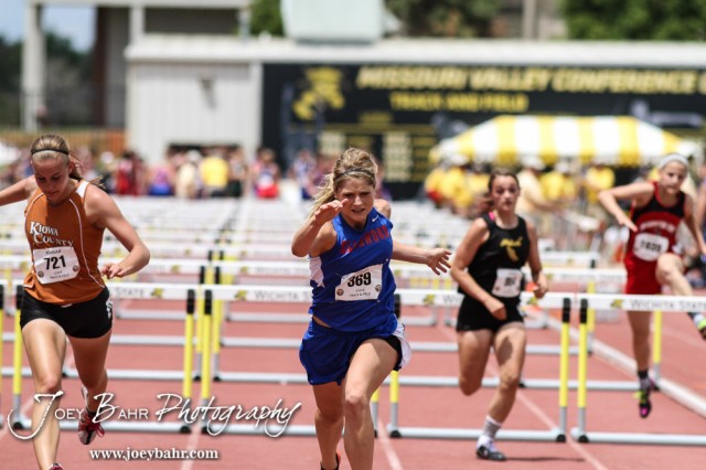 Sophie Hayes of Ellinwood crosses the finish line in the 2A Girls 100 Meter High Hurdles Preliminaries during the First Day of the 2014 KSHSAA State Track Meet at Cessna Stadium on the campus of Wichita State University in Wichita, Kansas on May 30, 2014. (Photo: Joey Bahr, www.joeybahr.com)