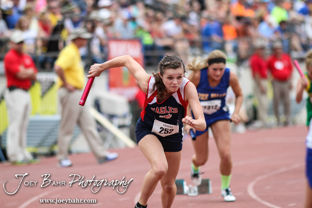 Clifton-Clyde’s Airika Long launches out of the starting blocks in the 1A Girls 4×100 Meter Relay Preliminaries during the First Day of the 2014 KSHSAA State Track Meet at Cessna Stadium on the campus of Wichita State University in Wichita, Kansas on May 30, 2014. (Photo: Joey Bahr, www.joeybahr.com)