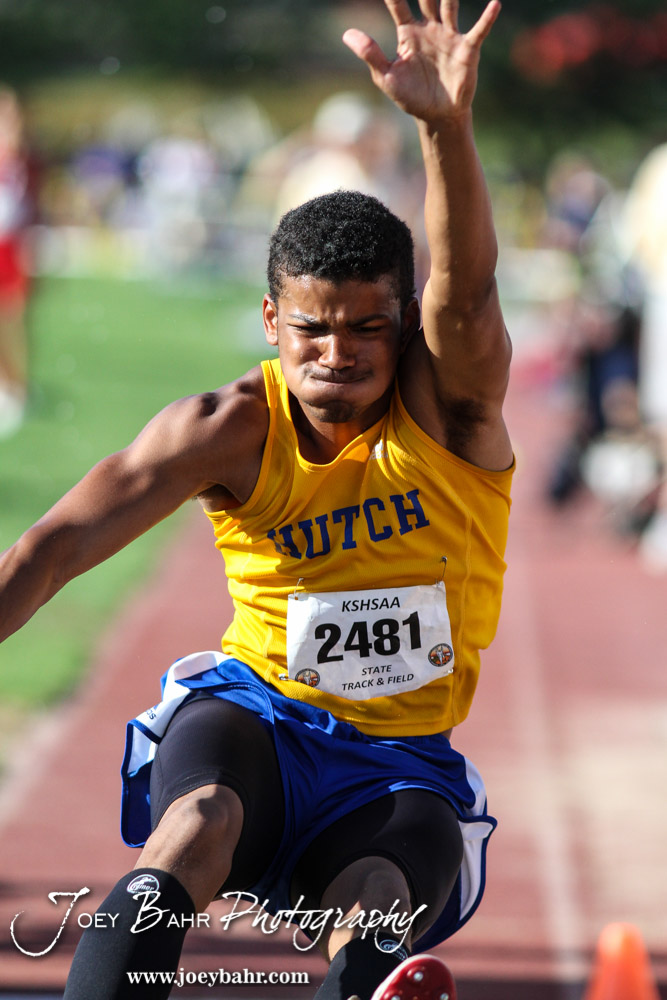 Hutchinson’s Wesey Chaney competes in the 6A Boys Long Jump during the First Day of the 2014 KSHSAA State Track Meet at Cessna Stadium on the campus of Wichita State University in Wichita, Kansas on May 30, 2014. (Photo: Joey Bahr, www.joeybahr.com)