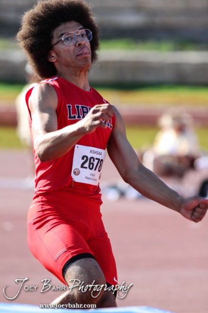 Liberal’s Chase Eatmon competes in the 5A Boys High Jump during the First Day of the 2014 KSHSAA State Track Meet at Cessna Stadium on the campus of Wichita State University in Wichita, Kansas on May 30, 2014. (Photo: Joey Bahr, www.joeybahr.com)