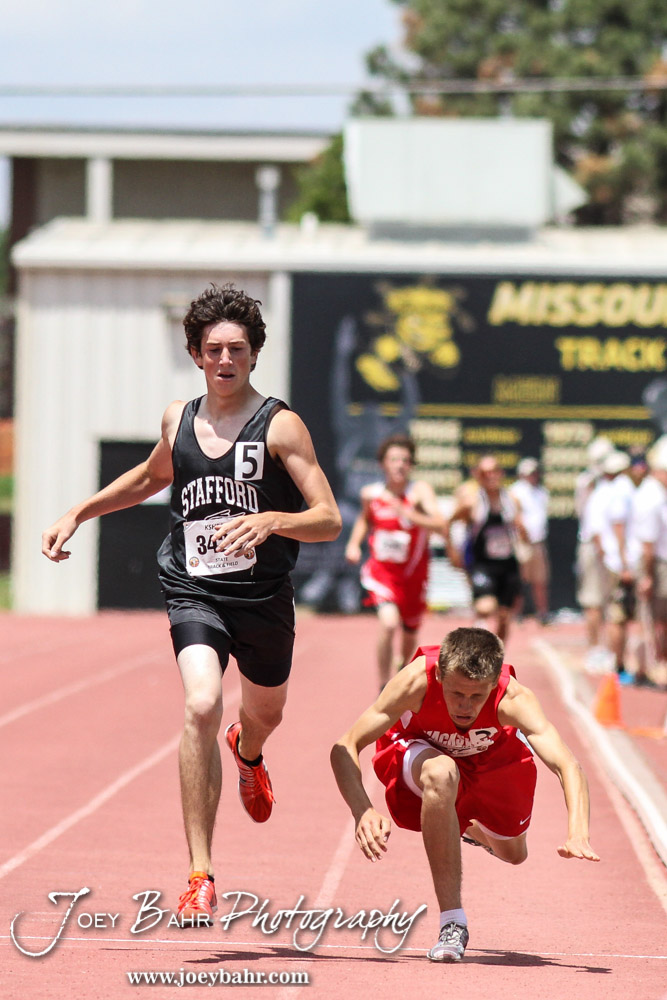 Macksville’s Henry Penner dives at the finish line as Stafford’s Derek McClure wins the 1A Boys 1600 Meter Run during the Second Day of the 2014 KSHSAA State Track Meet at Cessna Stadium on the campus of Wichita State University in Wichita, Kansas on May 31, 2014. (Photo: Joey Bahr, www.joeybahr.com)