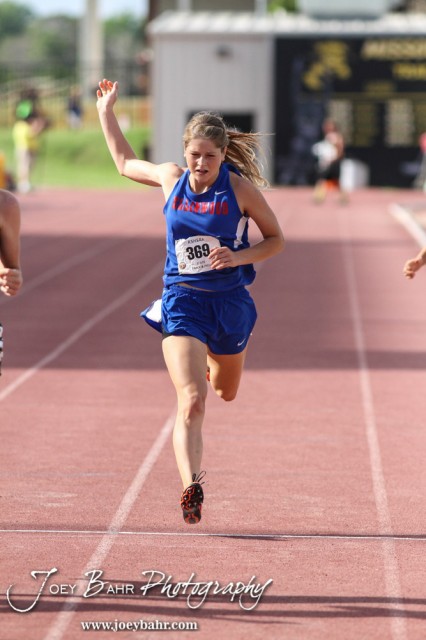 Ellinwood’s Sophie Hayes crosses the finish line in the 2A Girls 200 Meter Dash Finals during the Second Day of the 2014 KSHSAA State Track Meet at Cessna Stadium on the campus of Wichita State University in Wichita, Kansas on May 31, 2014. (Photo: Joey Bahr, www.joeybahr.com)