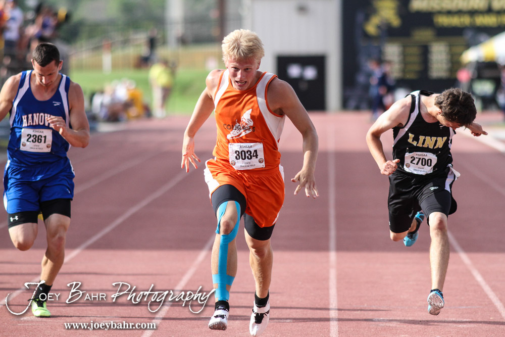 Otis-Bison’s Jordan Hoffman crosses the finish line to win the 1A Boys 200 Meter Dash during the Second Day of the 2014 KSHSAA State Track Meet at Cessna Stadium on the campus of Wichita State University in Wichita, Kansas on May 31, 2014. (Photo: Joey Bahr, www.joeybahr.com)