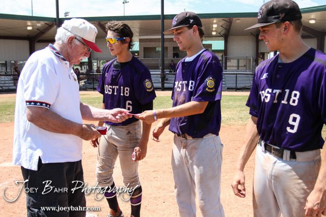 Bill Dureen of the American Legion Baseball Committee hands out the Champion Arm Patch to the players. The Arkansas City Grays defeated the Buhler Nationals 10 to 5 to win the American Legion Class A Baseball State Tournament Championship at the Great Bend Sports Complex in Great Bend, Kansas on July 24, 2016. (Photo: Joey Bahr, www.joeybahr.com)undefined
