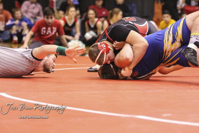 Landen Urban (Hoisington) pins Daylan Fell (Leon-Bluestem). Urban won third place in weight class 285 via pin fall. The KSHSAA Class 321A State Wrestling Championships were held at Gross Memorial Coliseum on the campus of Fort Hays State University in Hays, Kansas on February 25, 2017. (Photo: Joey Bahr, www.joeybahr.com)undefined