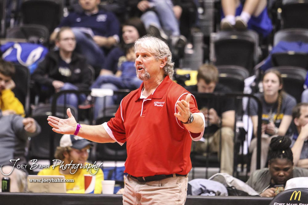Hoisington Head Coach Dan Schmidt talks to Tanner Cassity during the weight class 132 fifth place match. The KSHSAA Class 321A State Wrestling Championships were held at Gross Memorial Coliseum on the campus of Fort Hays State University in Hays, Kansas on February 25, 2017. (Photo: Joey Bahr, www.joeybahr.com)undefined