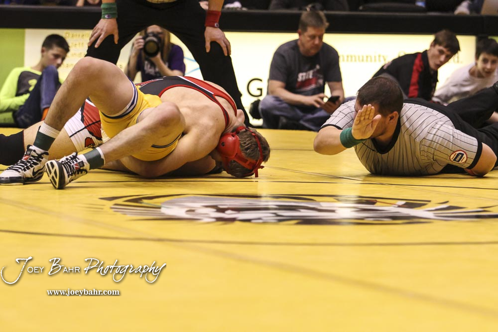 An official signals the pin by Christopher Ball (Hoisington) on Trenton Wright (Norton Community). Ball won the match and weight class 152 with a pin fall at 1:31 into the match. The KSHSAA Class 321A State Wrestling Championships were held at Gross Memorial Coliseum on the campus of Fort Hays State University in Hays, Kansas on February 25, 2017. (Photo: Joey Bahr, www.joeybahr.com)undefined