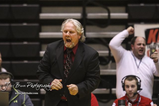 Hoisington Head Coach celebrates Christopher Ball’s State Championship win in weight class 152 over Trent Wright of Norton. The KSHSAA Class 321A State Wrestling Championships were held at Gross Memorial Coliseum on the campus of Fort Hays State University in Hays, Kansas on February 25, 2017. (Photo: Joey Bahr, www.joeybahr.com)undefined