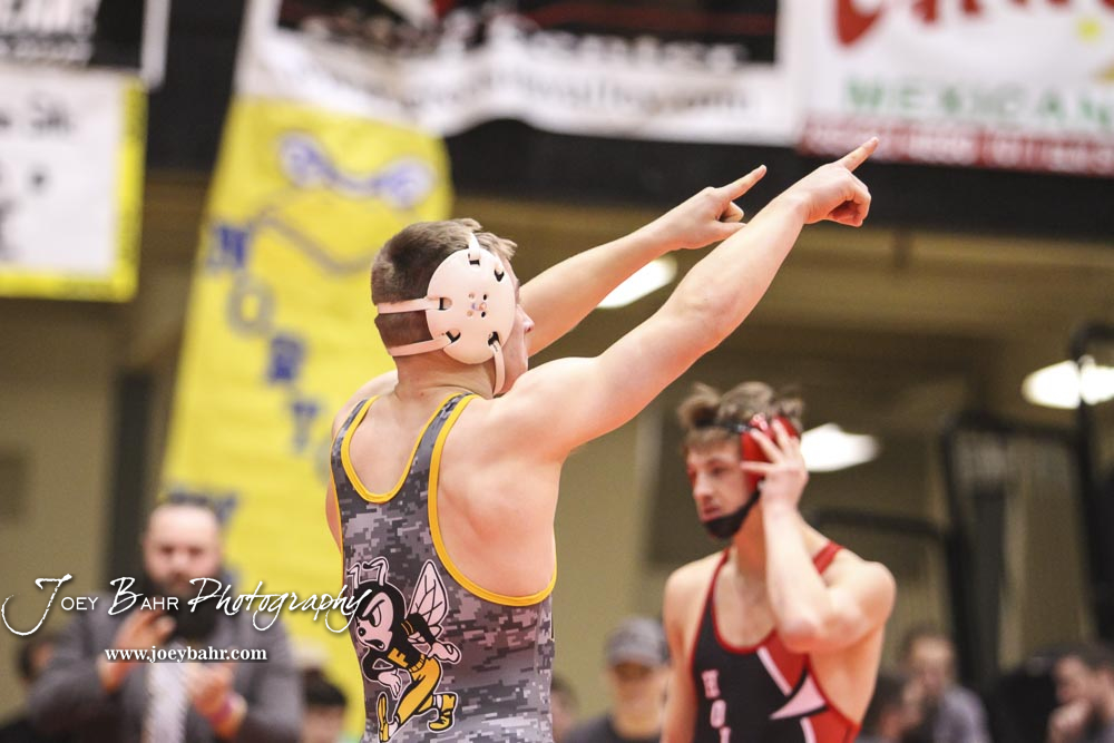 Devin Voth of Fredonia acknowledges his fans after winning the weight class 132 fifth place match by a 3 to 2 decision. The KSHSAA Class 321A State Wrestling Championships were held at Gross Memorial Coliseum on the campus of Fort Hays State University in Hays, Kansas on February 25, 2017. (Photo: Joey Bahr, www.joeybahr.com)undefined