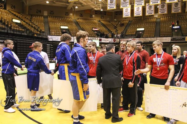 Members of the Norton and Hoisington Wrestling teams shake hands following the tournament. The KSHSAA Class 321A State Wrestling Championships were held at Gross Memorial Coliseum on the campus of Fort Hays State University in Hays, Kansas on February 25, 2017. (Photo: Joey Bahr, www.joeybahr.com)undefined