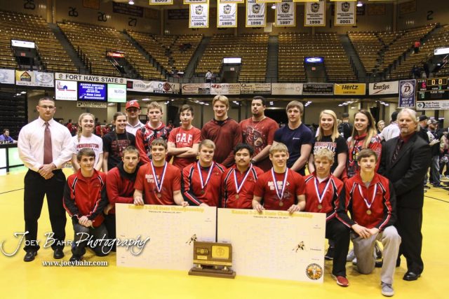The Hoisington Cardinals line up for a picture with the State Runner-up Trophy. The KSHSAA Class 321A State Wrestling Championships were held at Gross Memorial Coliseum on the campus of Fort Hays State University in Hays, Kansas on February 25, 2017. (Photo: Joey Bahr, www.joeybahr.com)undefined