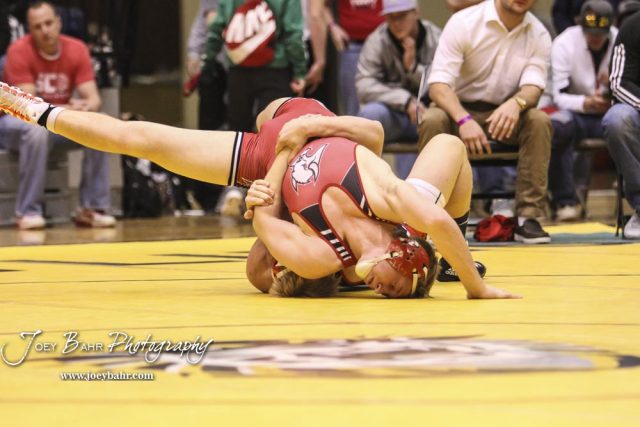Sean Urban (Hoisington) tosses Maverick Green (Atwood-Rawlins County). Urban won the weight class 160 fifth place match with a 9 to 3 decision. The KSHSAA Class 321A State Wrestling Championships were held at Gross Memorial Coliseum on the campus of Fort Hays State University in Hays, Kansas on February 25, 2017. (Photo: Joey Bahr, www.joeybahr.com)undefined