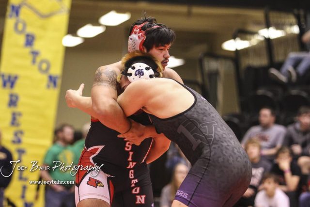 Justin Bradley (Hoisington) holds the arms of Blake Garrison (Hoyt-Royal Valley). Bradley won the weight class 220 fifth place with a 6 to 3 decision. The KSHSAA Class 321A State Wrestling Championships were held at Gross Memorial Coliseum on the campus of Fort Hays State University in Hays, Kansas on February 25, 2017. (Photo: Joey Bahr, www.joeybahr.com)undefined