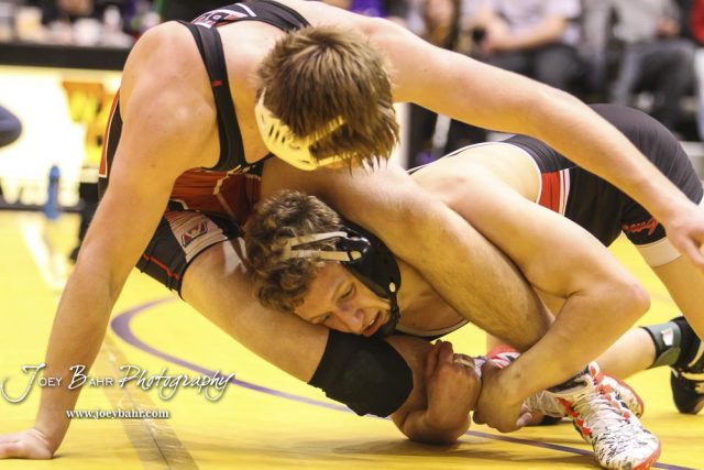 Isaiah Luellen (Rossville) takes down Maverick Green (Atwood-Rawlins County) in the weight class 160 semi-final. The KSHSAA Class 321A State Wrestling Championships were held at Gross Memorial Coliseum on the campus of Fort Hays State University in Hays, Kansas on February 24, 2017. (Photo: Joey Bahr, www.joeybahr.com)undefined