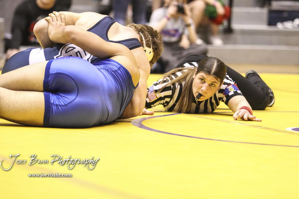 An official looks to see if Mikey Waggoner (Riley County) completes the pin of Tony Morris (Halstead) in the weight class 170 semi-final. The KSHSAA Class 321A State Wrestling Championships were held at Gross Memorial Coliseum on the campus of Fort Hays State University in Hays, Kansas on February 24, 2017. (Photo: Joey Bahr, www.joeybahr.com)undefined