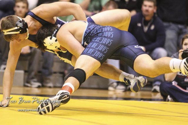 Josh Seabolt (Cimarron) takes down Cauy Rokey (Sabetha) in the weight class 182 semi-final. The KSHSAA Class 321A State Wrestling Championships were held at Gross Memorial Coliseum on the campus of Fort Hays State University in Hays, Kansas on February 24, 2017. (Photo: Joey Bahr, www.joeybahr.com)undefined