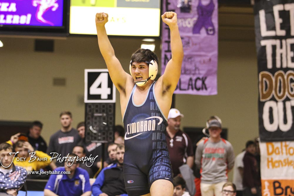 Josh Seabolt (Cimarron) celebrates winning over Cauy Rokey (Sabetha) in the weight class 182 semi-final. The KSHSAA Class 321A State Wrestling Championships were held at Gross Memorial Coliseum on the campus of Fort Hays State University in Hays, Kansas on February 24, 2017. (Photo: Joey Bahr, www.joeybahr.com)undefined