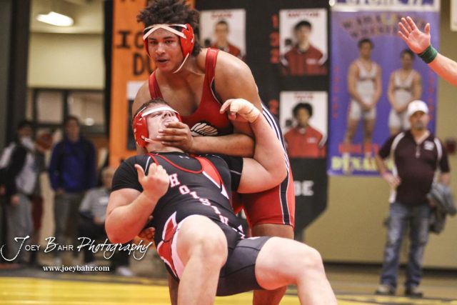 Taye Washington (Hoxie) tosses Landen Urban (Hoisington) in the weight class 285 semi-final. The KSHSAA Class 321A State Wrestling Championships were held at Gross Memorial Coliseum on the campus of Fort Hays State University in Hays, Kansas on February 24, 2017. (Photo: Joey Bahr, www.joeybahr.com)undefined