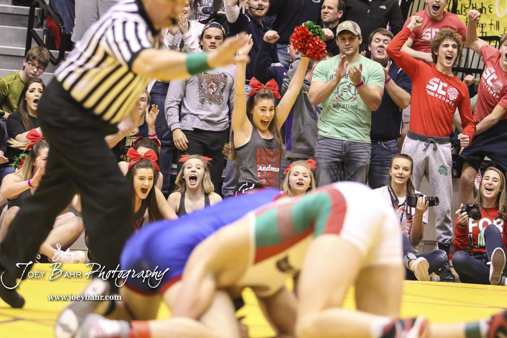A cheerleader celebrates Colton Hutchinson’s (Smith Center) win in the weight class 145 semi-finals. The KSHSAA Class 321A State Wrestling Championships were held at Gross Memorial Coliseum on the campus of Fort Hays State University in Hays, Kansas on February 24, 2017. (Photo: Joey Bahr, www.joeybahr.com)undefined